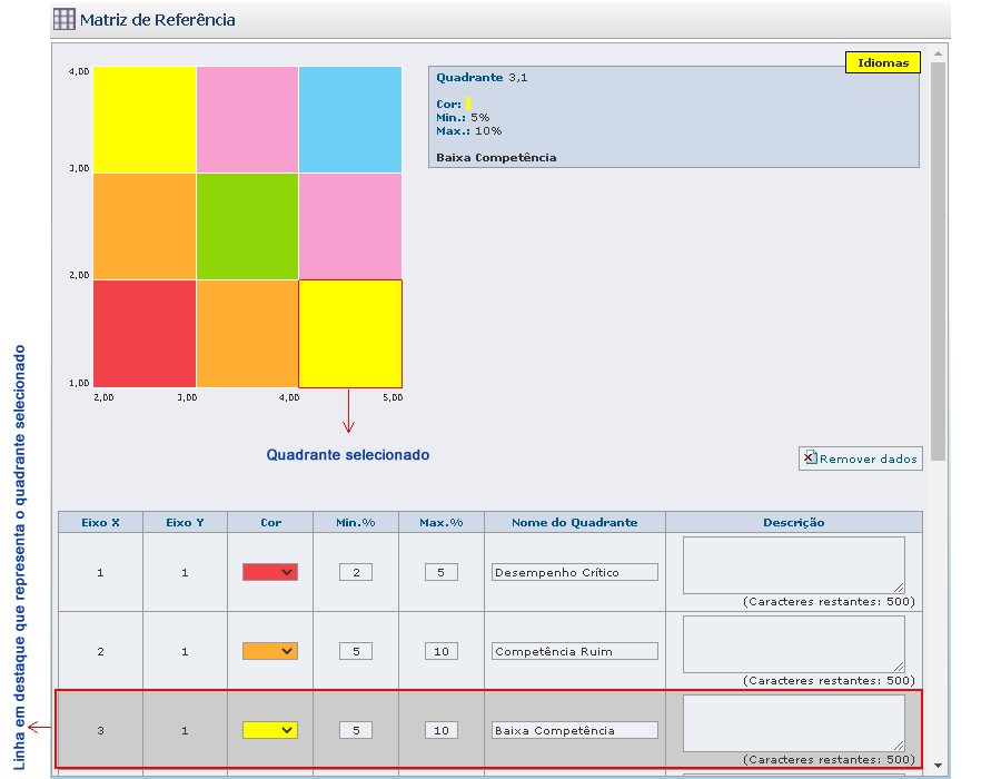 Estabeleça nas colunas Min. % e Máx. % o valor de referência. Esse valor é o número de pessoas que serão apresentadas no quadrante, tanto para mínimo quanto para máximo.