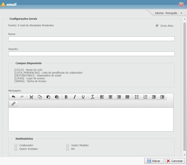 Marque a opção Envio Ativo caso o e-mail cadastrado deva ser enviado de acordo com as configurações selecionadas.