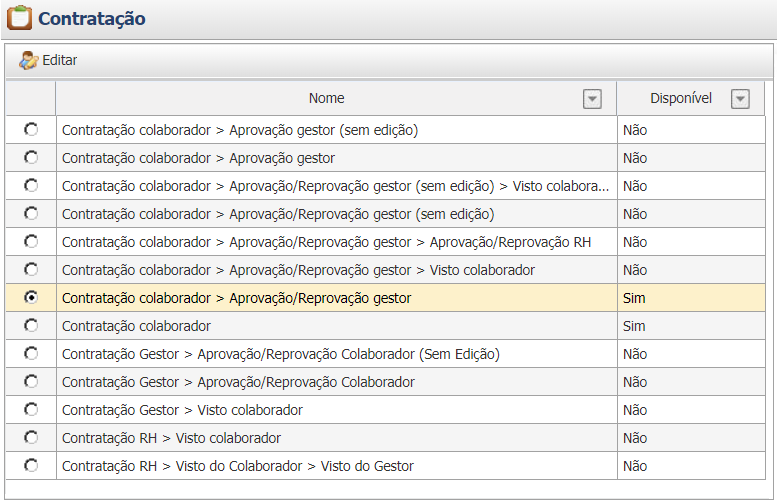 Foi selecionando em Workflow - Individual - Contratação, a opção Contratação colaborador > Aprovação/Reprovação gestor.