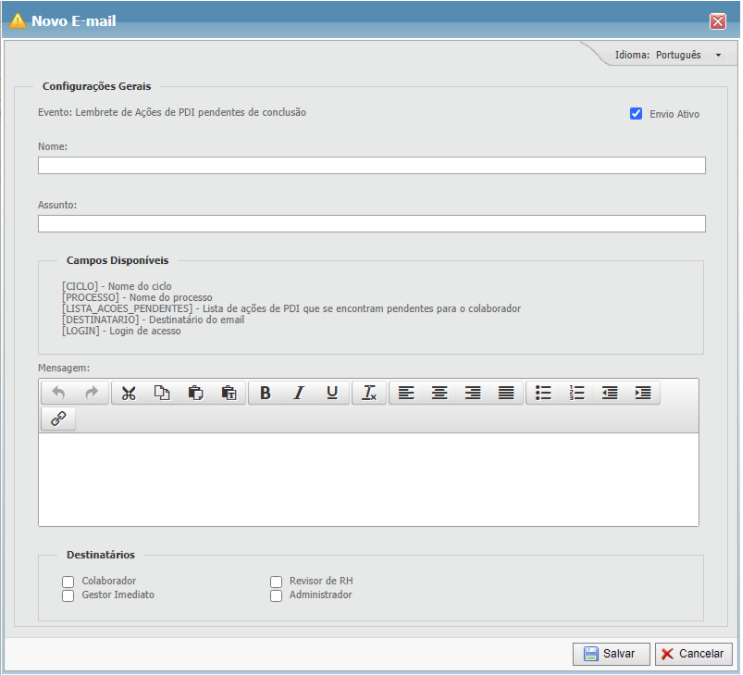 Marque a opção Envio Ativo caso o e-mail cadastrado deva ser enviado de acordo com as configurações selecionadas.