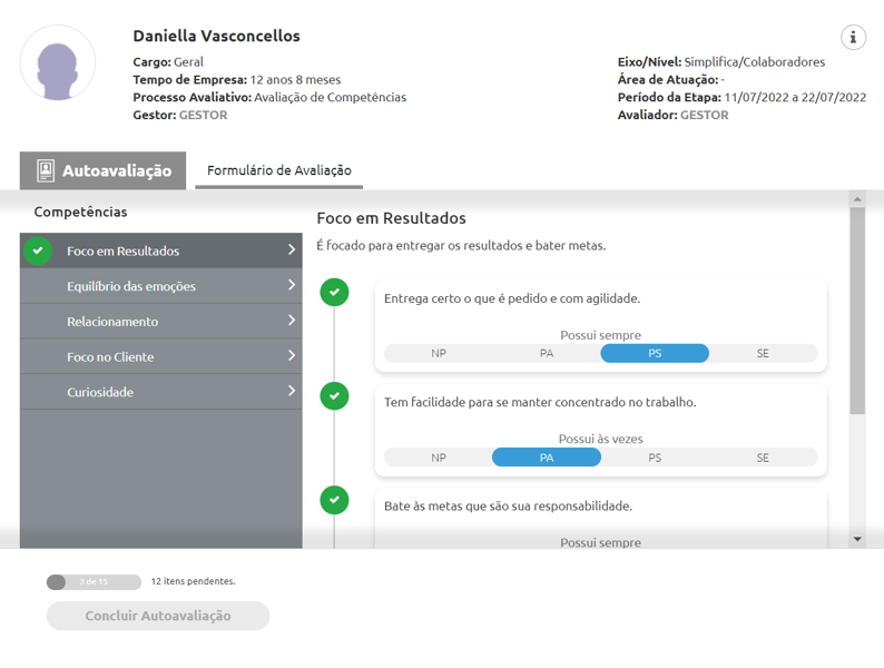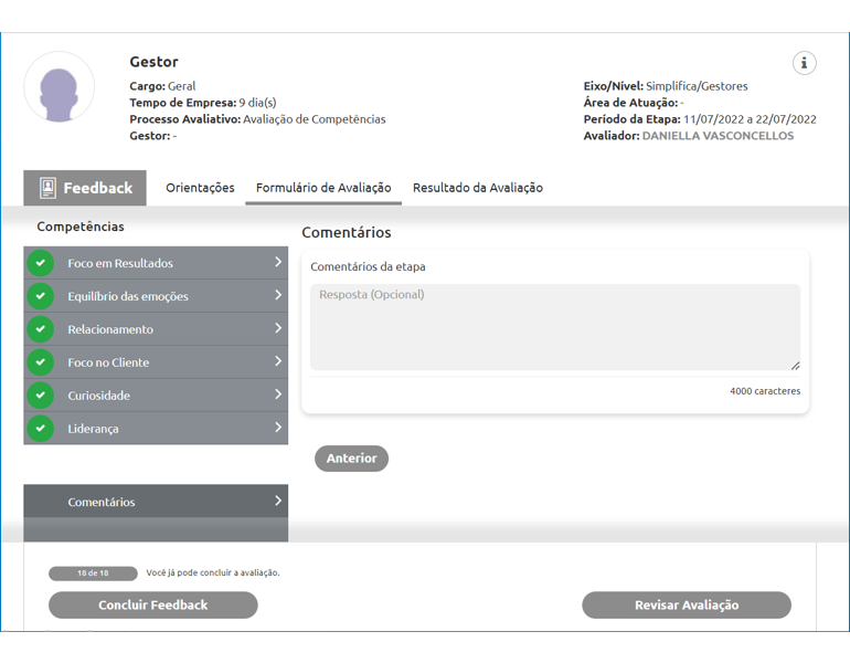 Nessa seção é possível realizar o preenchimento do formulário de avaliação, onde o colaborador poderá fazer uma autoavaliação analisando a sua própria performance, e também avaliando o seu gestor e pares quando houver. Assim como o colaborador o gestor irá avaliar os seus subordinados para compor a nota de avaliação, com isso, obtendo um resultado final, e a partir dos valores adquiridos é realizado o feedback com o colaborador, apresentando os dados da avaliação de competência.