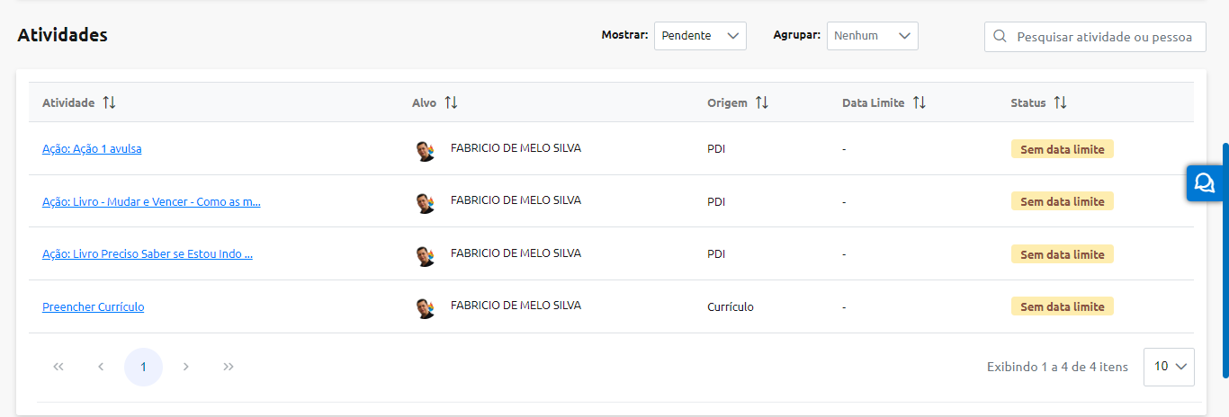 A seção Minhas Atividades exibe todas as ações do colaborador logado, sendo exibidas também as atividades a partir do que o colaborador selecionar nos campos Mostrar e Agrupar. Como nas outras seções, essa lista é influenciada pelo campo Ciclo, ou seja, são exibidas aqui as atividades pendentes de cada ciclo que for selecionado.
