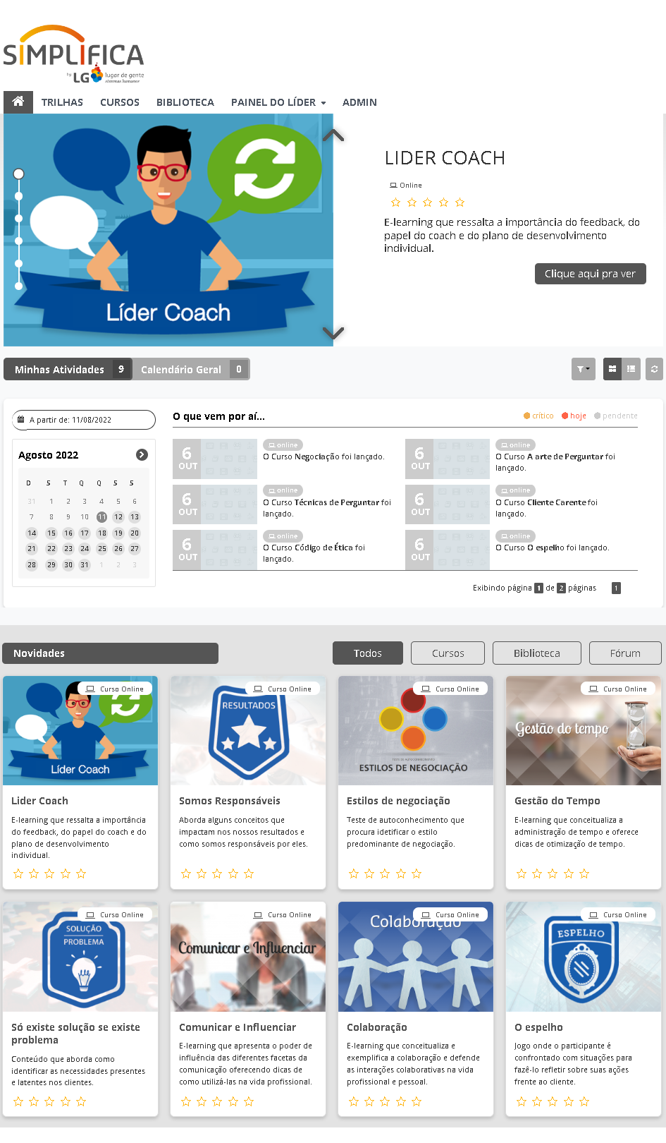 Através da seção Faça aqui seus treinamentos é possível ter acesso aos cursos online, podcasts, artigos, vídeos e tutoriais. Ao ser clicada o usuário será direcionado a plataforma de treinamentos, onde pode navegar em ricos conteúdos comportamentais, comerciais e administrativo. Veja abaixo o exemplo da tela de treinamentos: