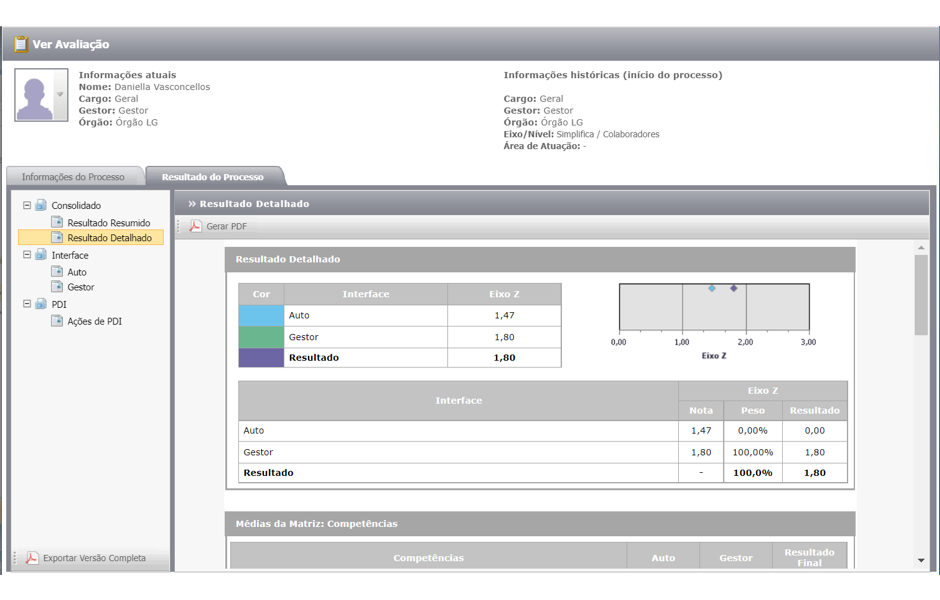 O Formulário Ver Avaliação, apresenta o resultado resumido e detalhado da avaliação, contendo a média das notas adquiridas na autoavaliação, avaliação do gestor e também dos pares. Além da escala de evolução do colaborador é possível visualizar também através de gráficos as médias da matriz de competências.