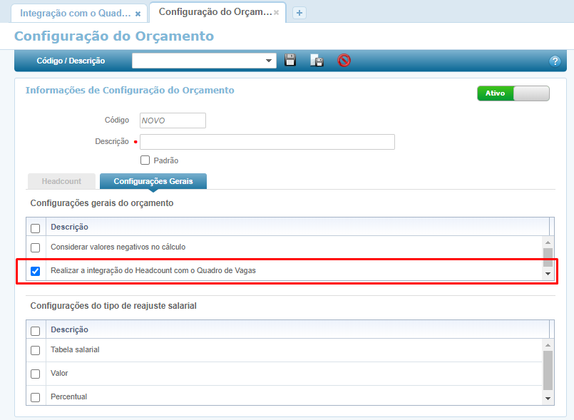 Para realizar a integração entre os registros de Vagas e Aumento de quadro da funcionalidade Headcount com o Quadro de Vagas é necessário marcar a opção Realizar a integração do Headcount com o Quadro de Vagas, localizada na guia Configurações Gerais da funcionalidade Configuração do Orçamento.